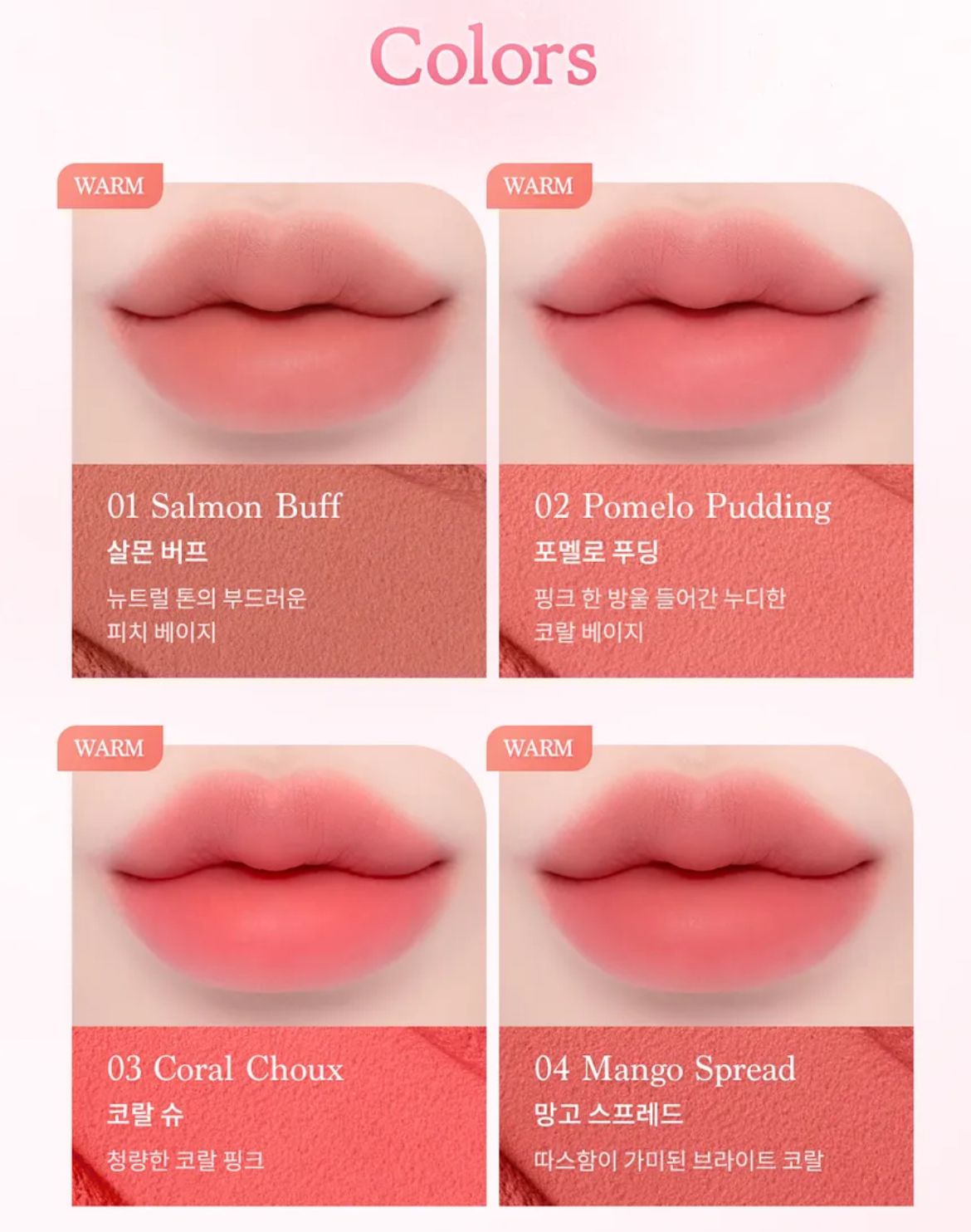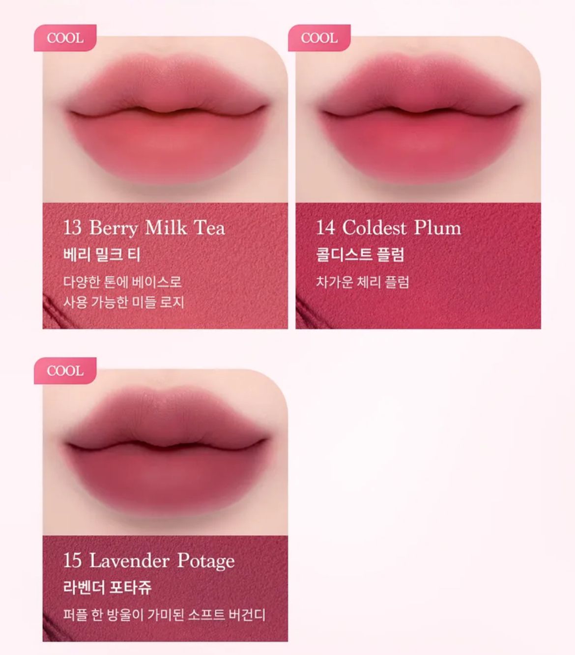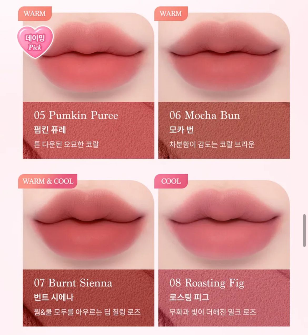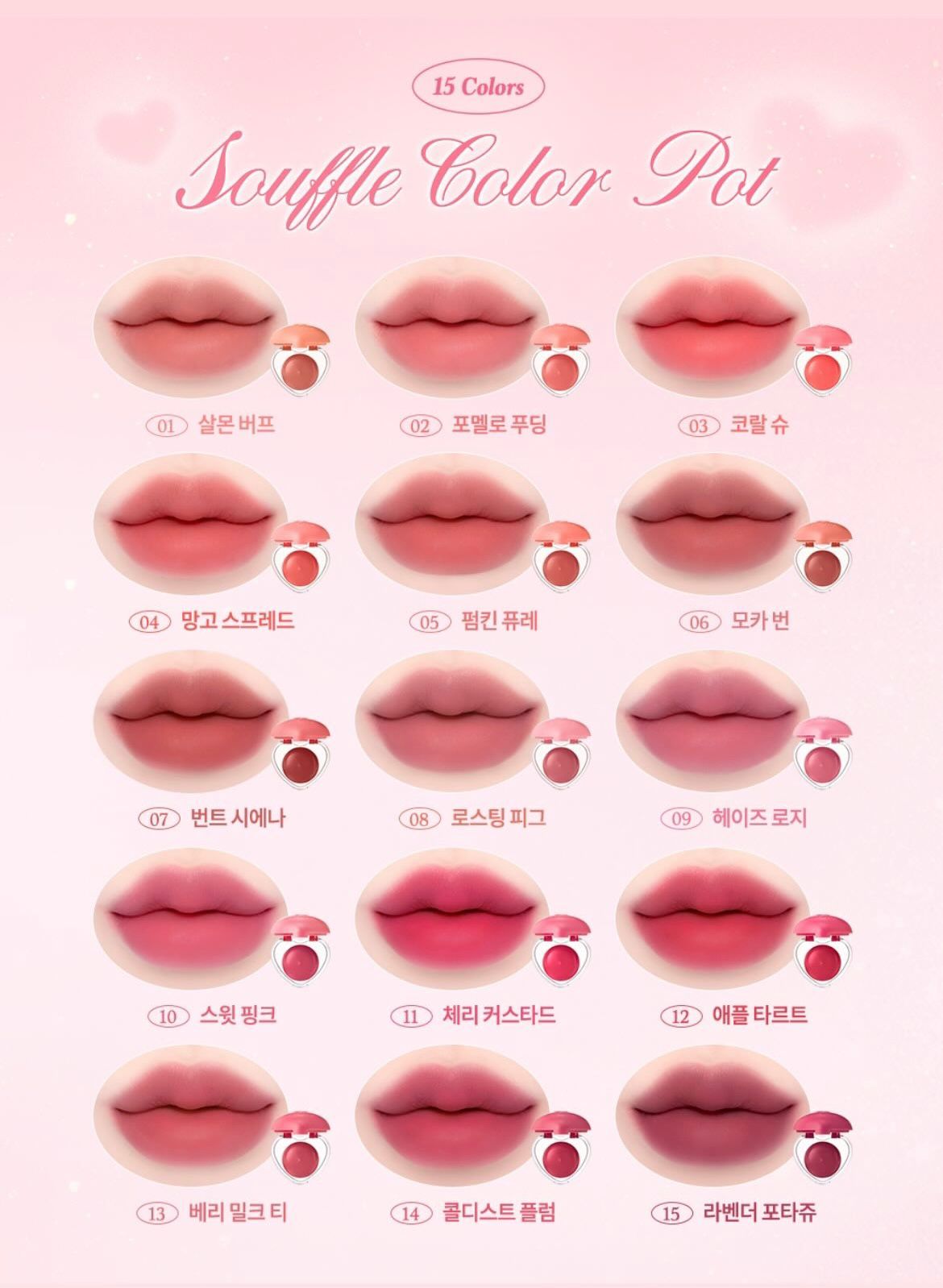 | Dasique Color Pot | # 03Coral Choux, #01 Salmo Buff, #02 Pomelo Pudding, #04 Mango Spread, #05 Pumpkin Puree, #06 Mocha Bun, #07 Burnt Sienna, #08 Roasting Fig, #09 Hazy Rosy, #10 Sweet Pink, #11 Cherry Custard, #12 Apple Tarte, #13 Berry Milk Tea, #14 Coldest Plum, #15 Lavender Potage |
