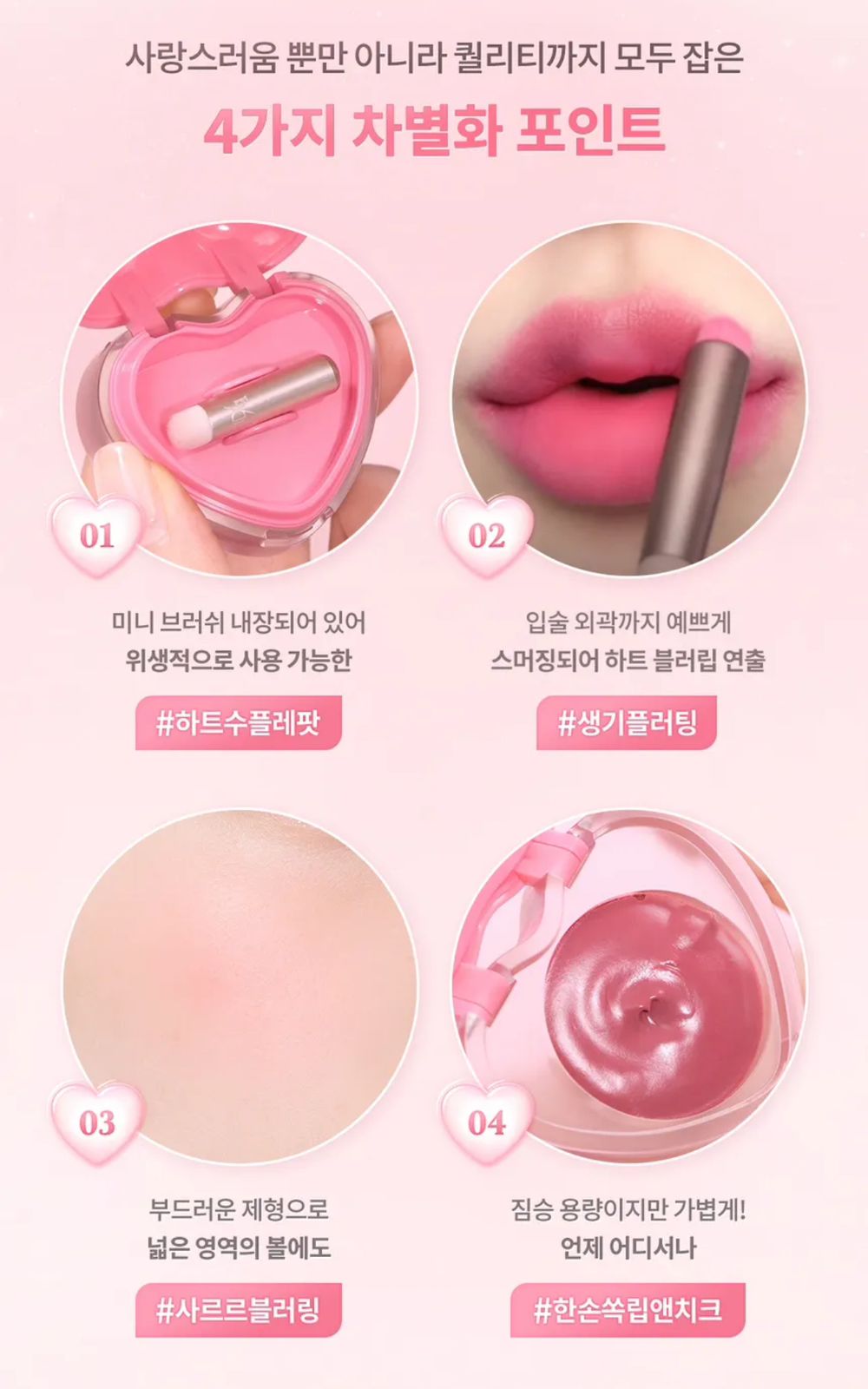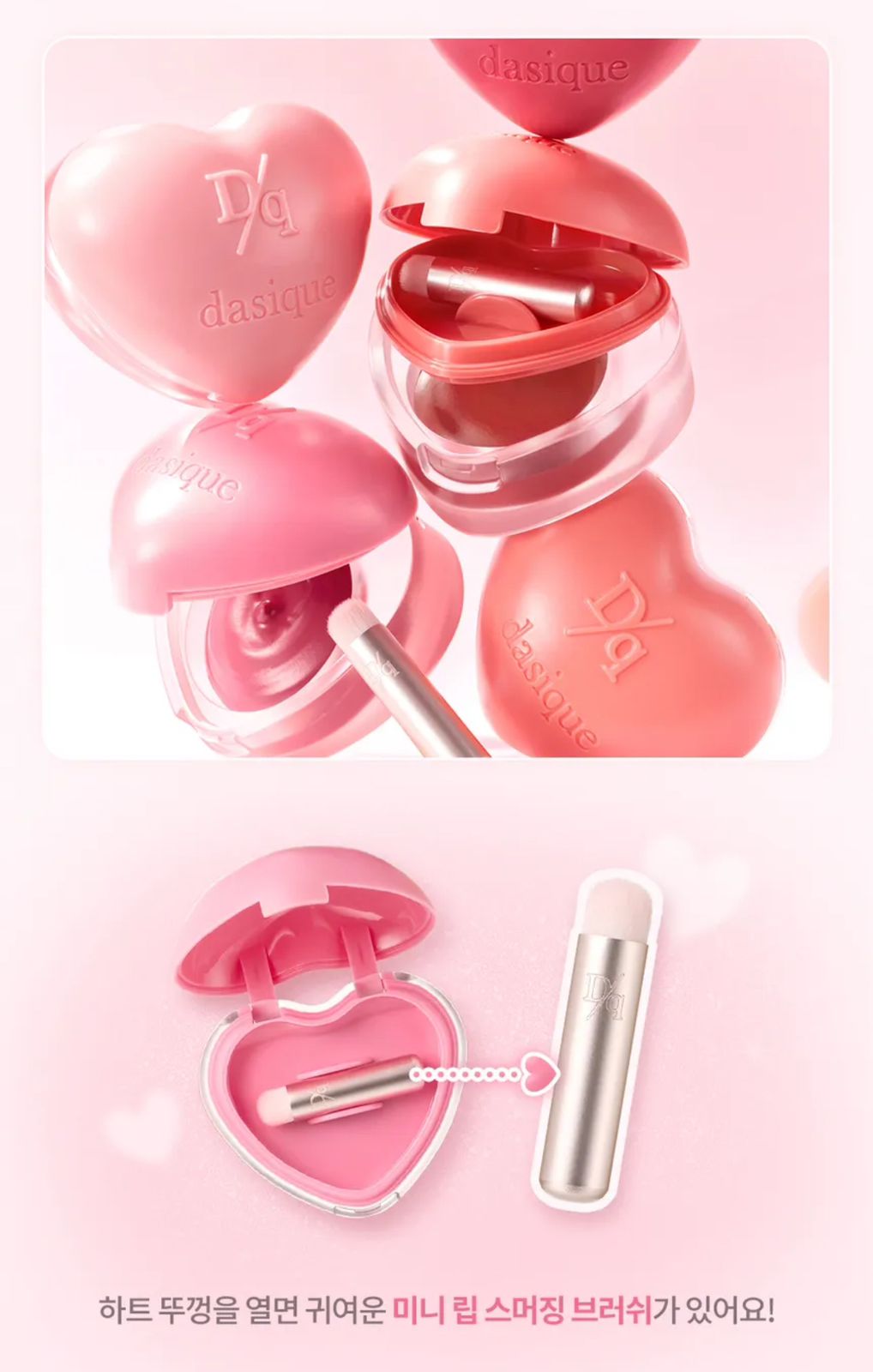Un práctico y portátil bote con forma de corazón que permite maquillar fácilmente los labios y las mejillas.