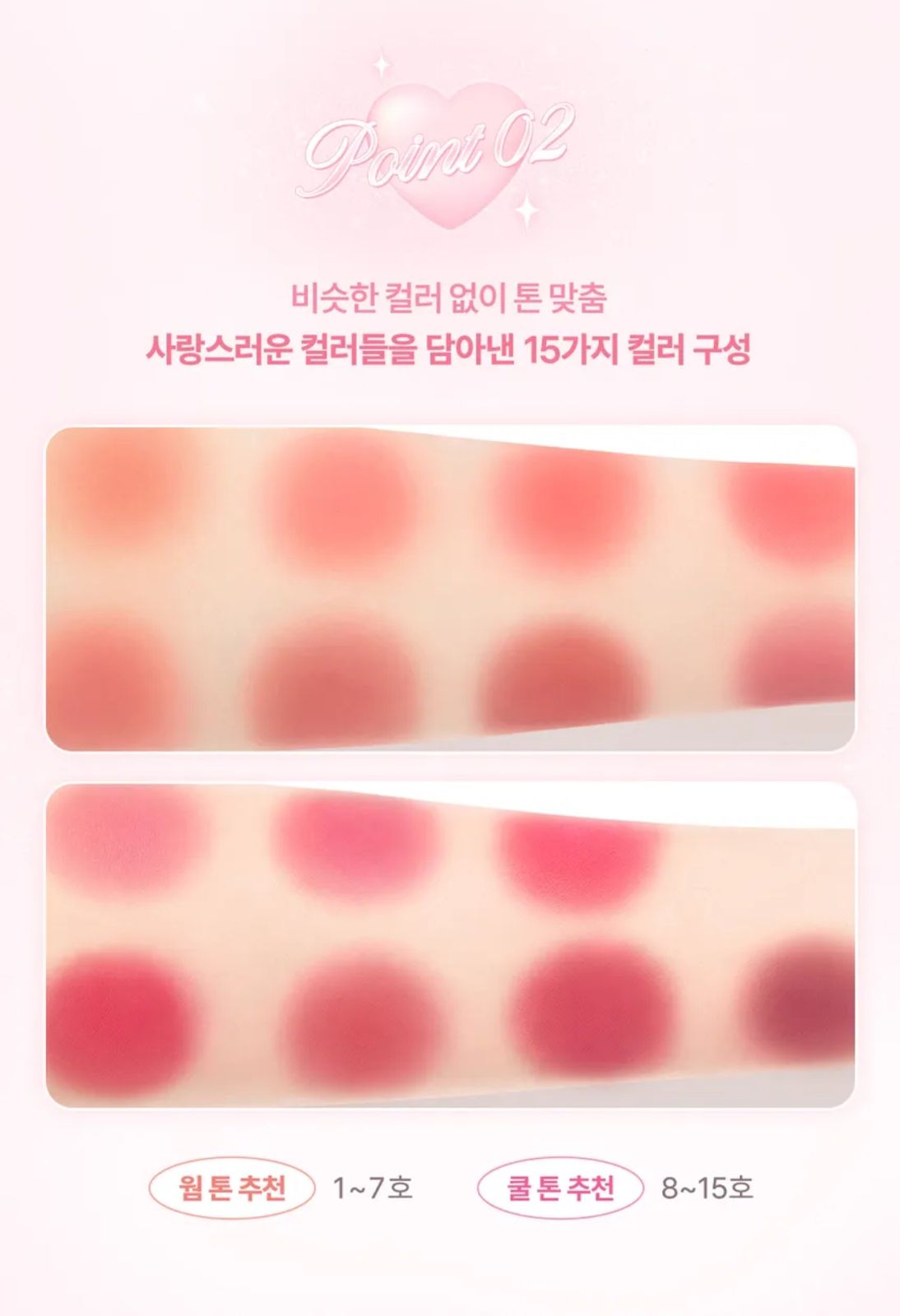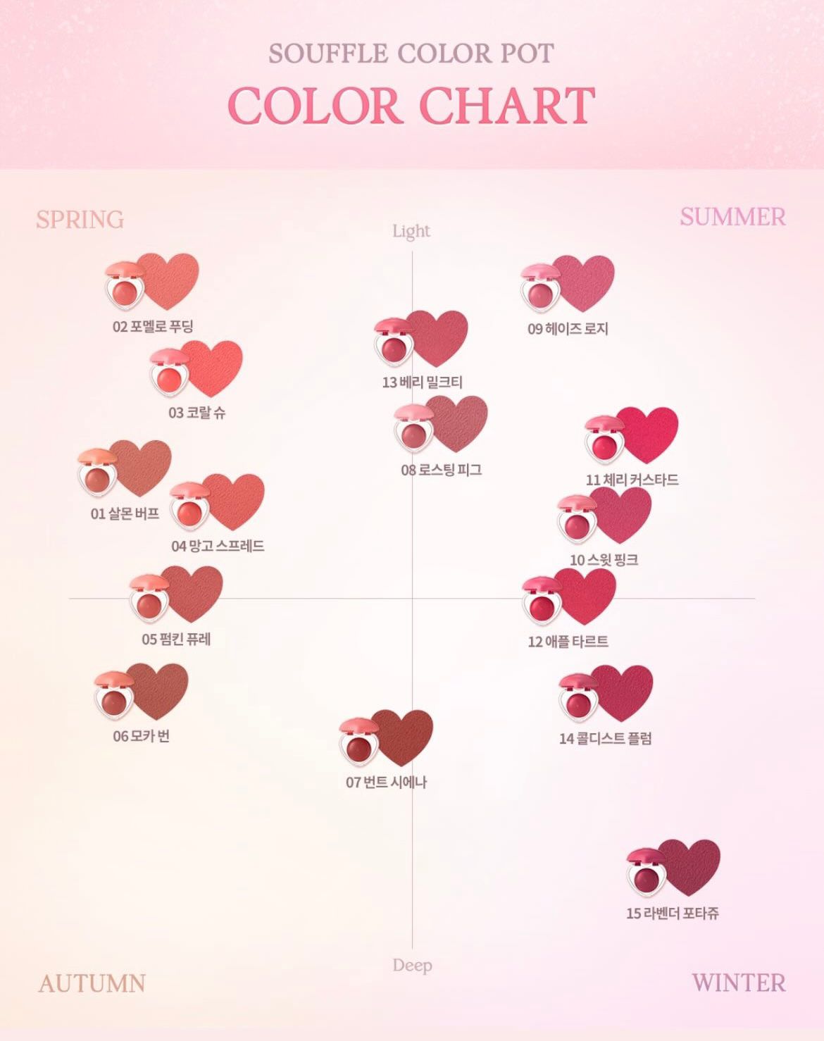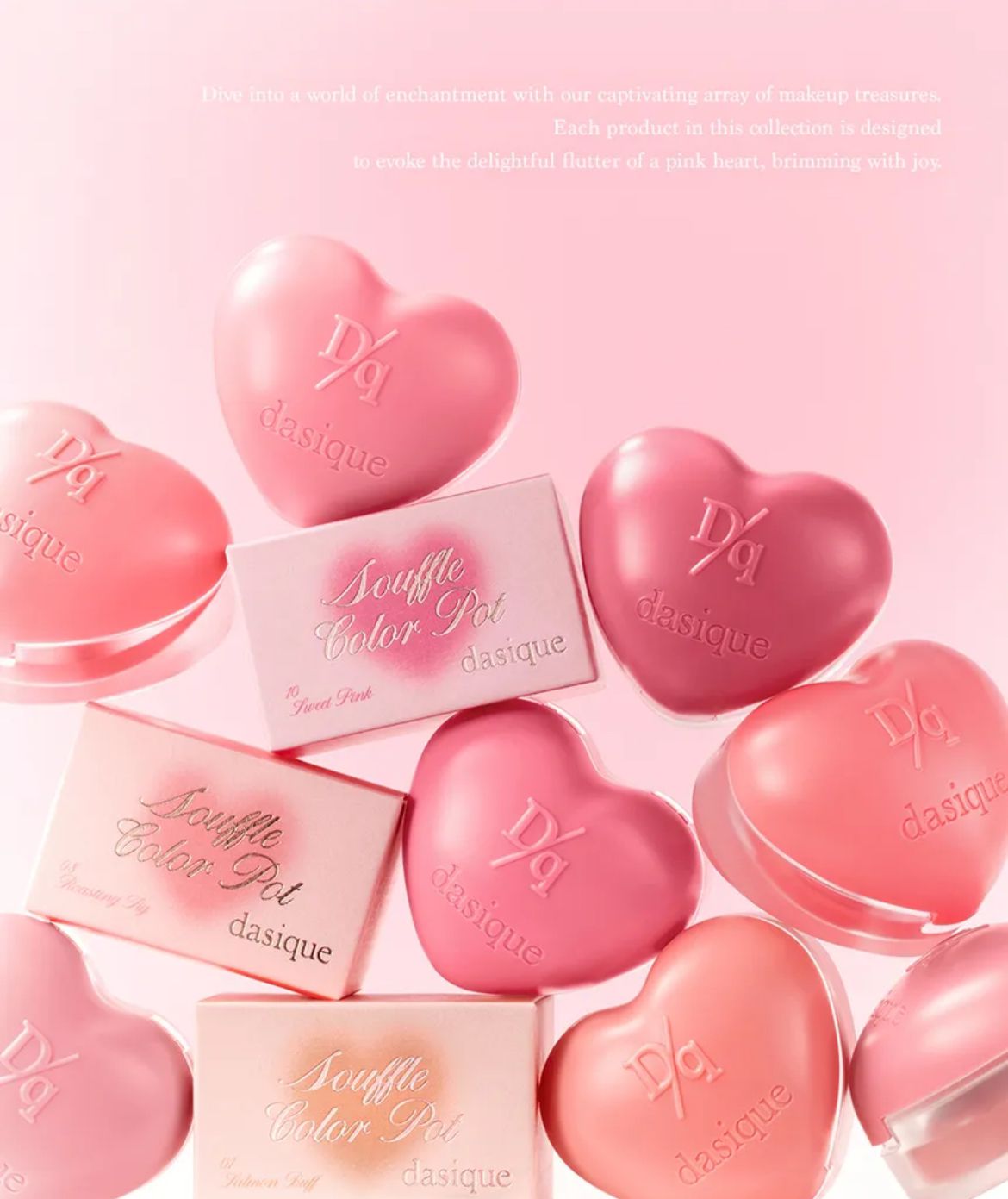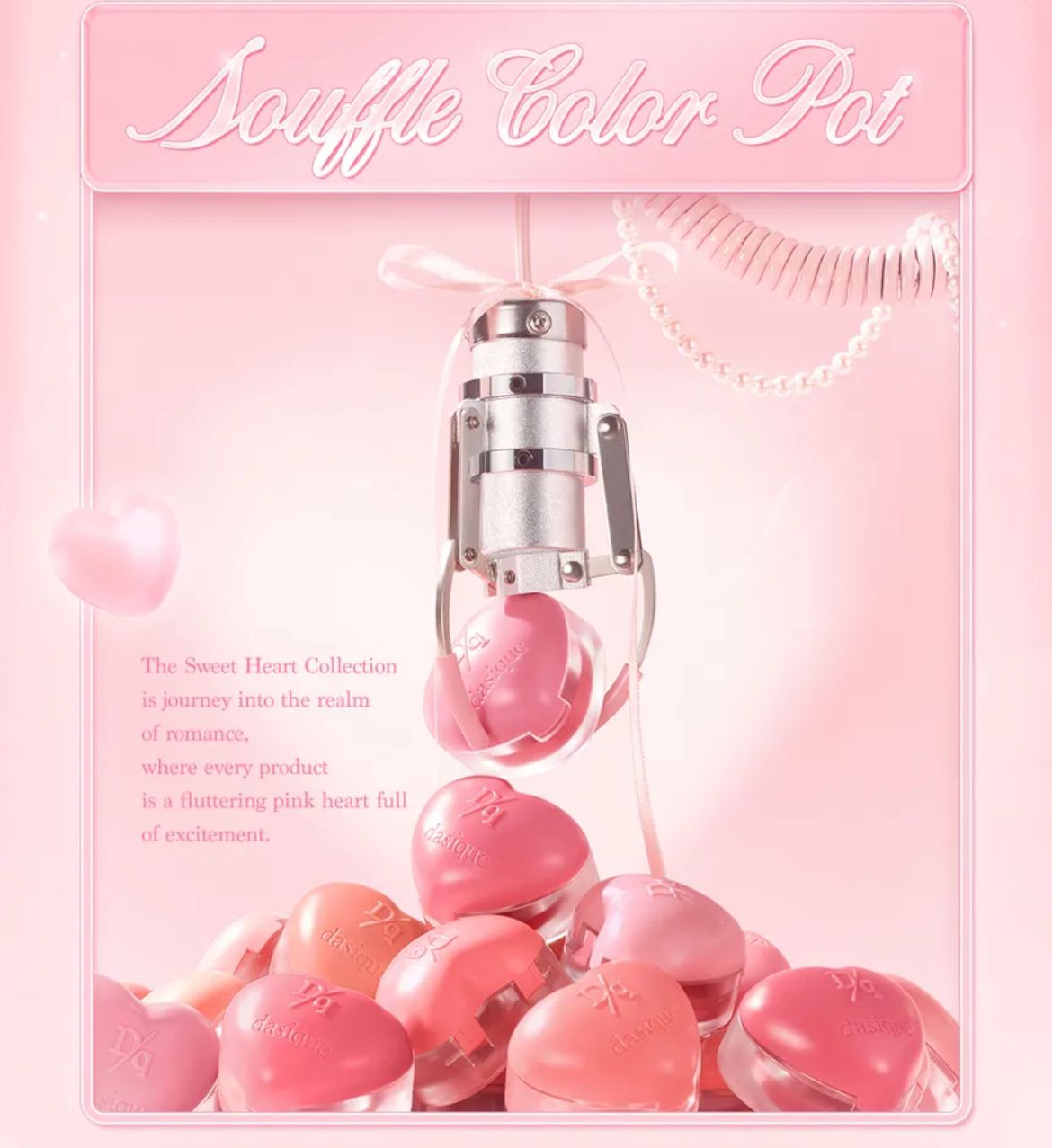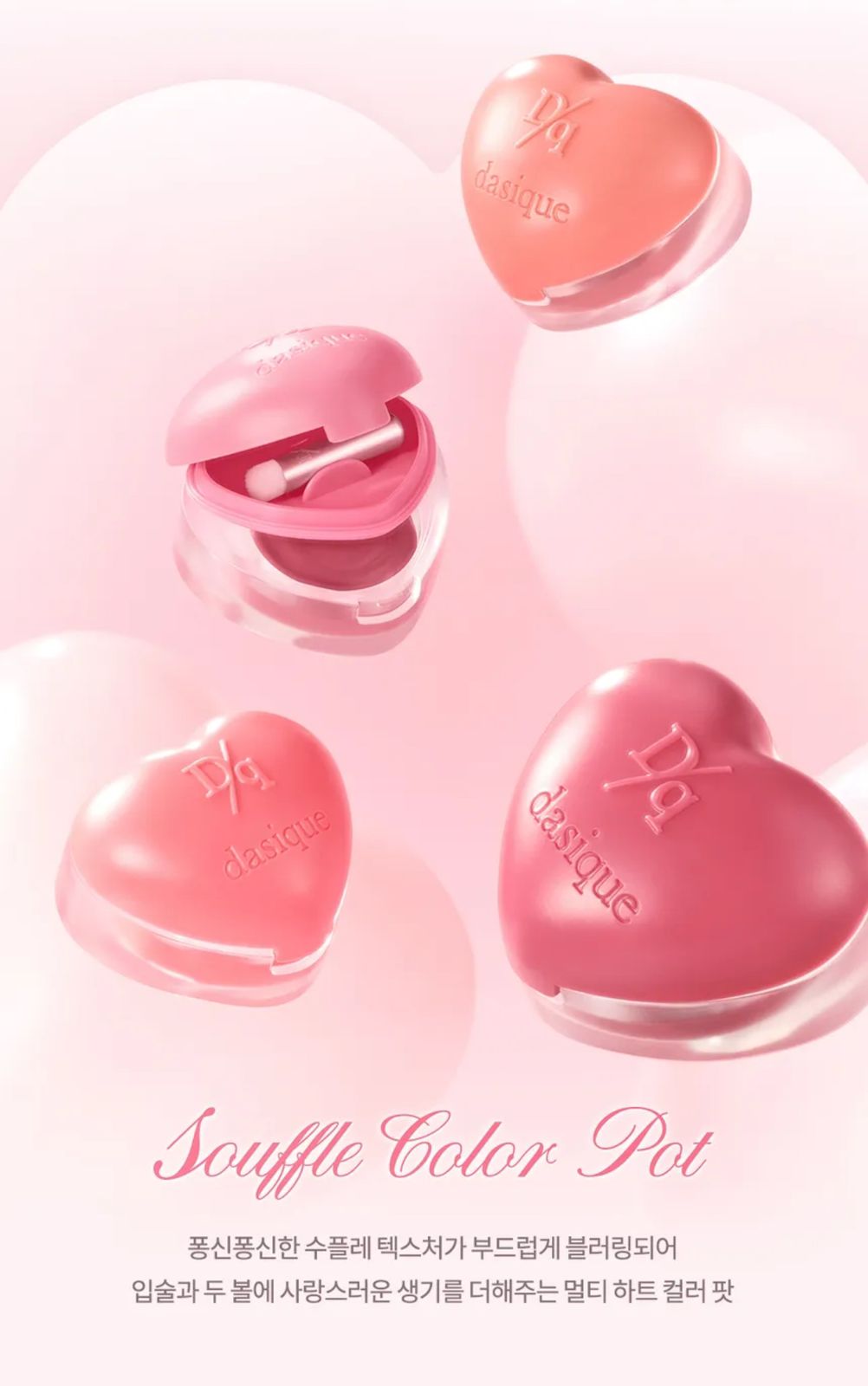 Souffle Color Pot de la colección Sweet Heart, un bálsamo de color de doble uso, presenta 15 tonos de dulces rosas cálidos y románticos rosas fríos que permiten una amplia gama de looks versátiles para labios y mejillas.